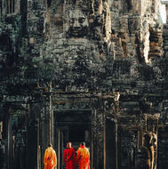 Siem Reap, a resort town in northwestern Cambodia, is the gateway to the ruins of Angkor, the seat of the Khmer kingdom from the 9th–15th centuries. Angkor’s vast complex of intricate stone buildings includes preserved Angkor Wat, the main temple, which is pictured on Cambodia’s flag. Giant, mysterious faces are carved into the Bayon Temple at Angkor Thom